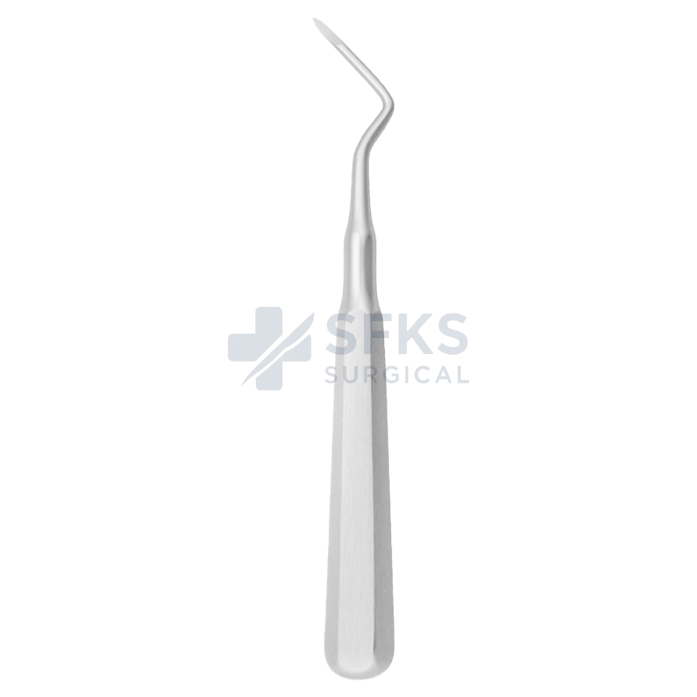 The Left Curved Dental Root Elevator is a professional-grade instrument for safe and precise removal of root fragments and fractured teeth. Crafted from high-quality stainless steel, it offers durability and corrosion resistance. Therefore, it is reliable for repeated sterilization and long-term use in dental clinics. Its left-curved design allows clinicians to reach difficult areas in the oral cavity. As a result, procedures are more precise and cause less trauma to surrounding tissues.